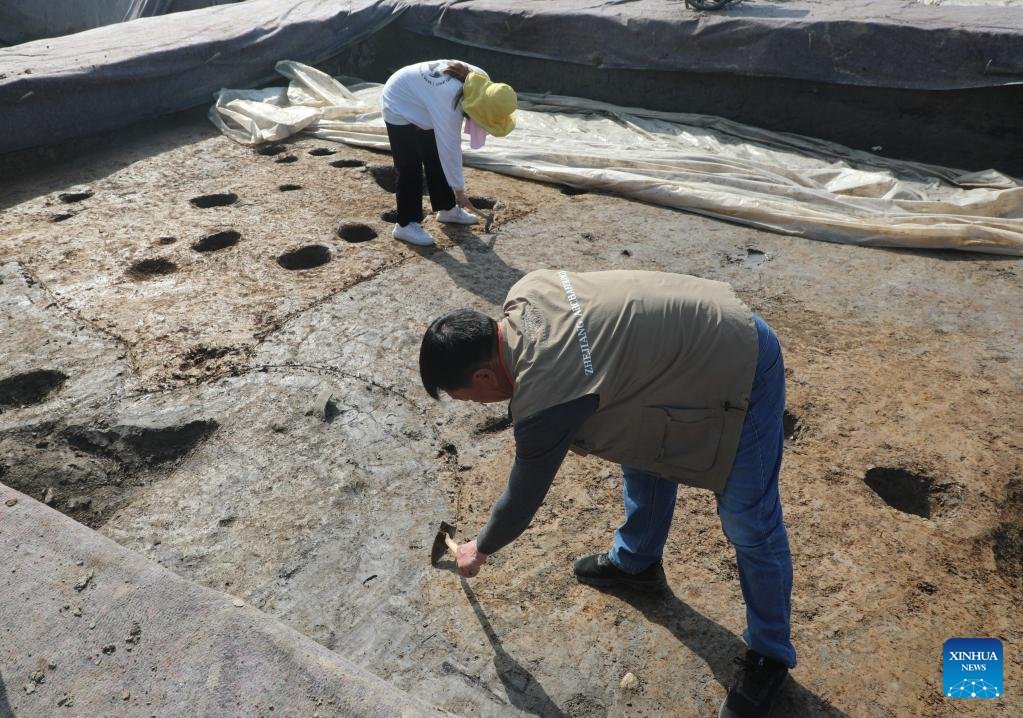 This undated photo shows archaeologists working at the Dahutou Site in Yuecheng District of Shaoxing City, east China's Zhejiang Province. (Zhejiang Institute of Cultural Relics and Archaeology/Handout via Xinhua)