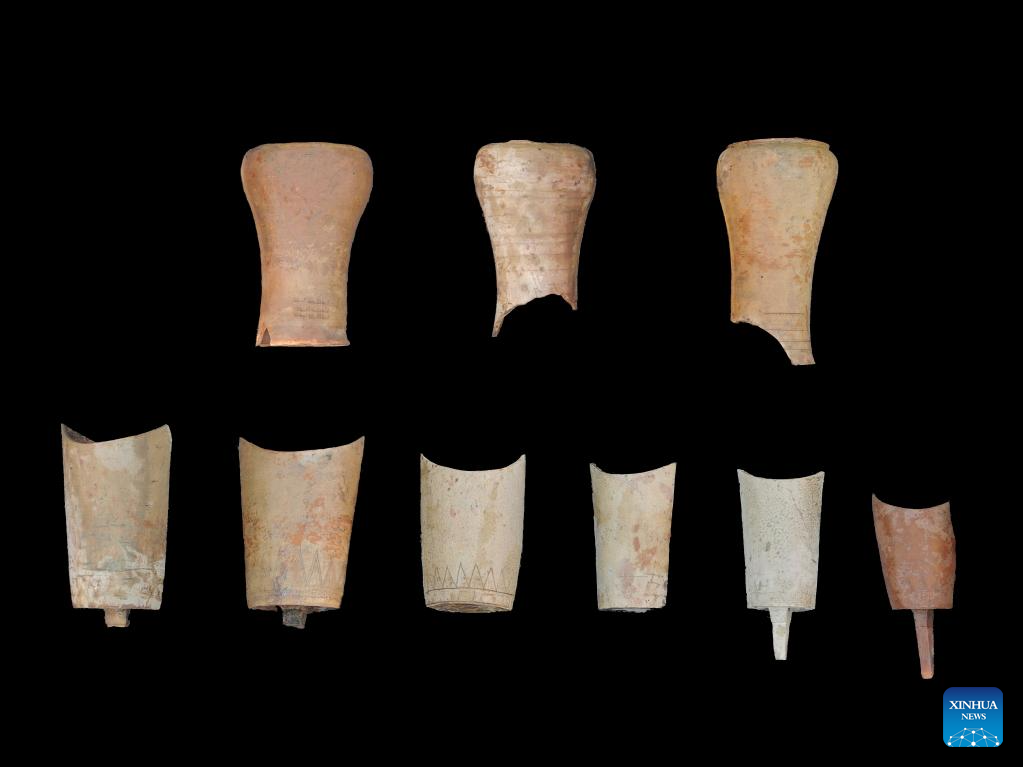 This undated photo shows a porcelain musical instrument set unearthed at the Dahutou Site in Yuecheng District of Shaoxing City, east China's Zhejiang Province. (Zhejiang Institute of Cultural Relics and Archaeology/Handout via Xinhua)