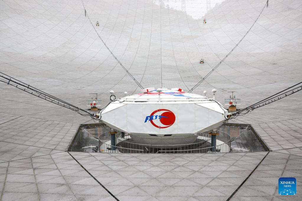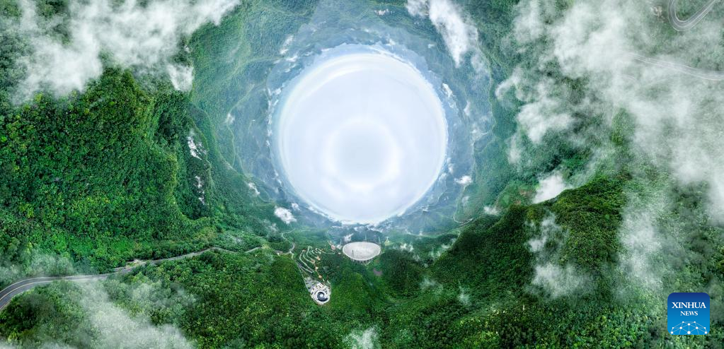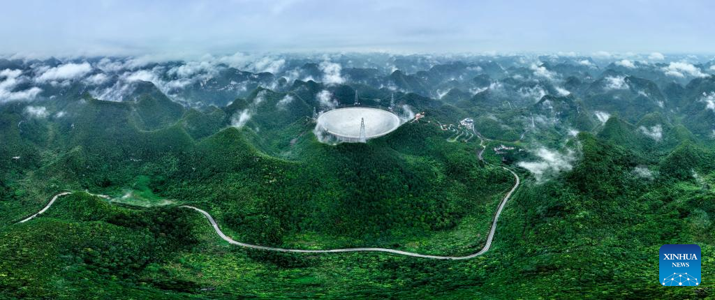 This aerial photo taken on June 22, 2023 shows China's Five-hundred-meter Aperture Spherical Radio Telescope (FAST) under maintenance in southwest China's Guizhou Province. China's FAST telescope identified a binary pulsar with an orbital period of 53.3 minutes, the shortest known period for a pulsar binary system.