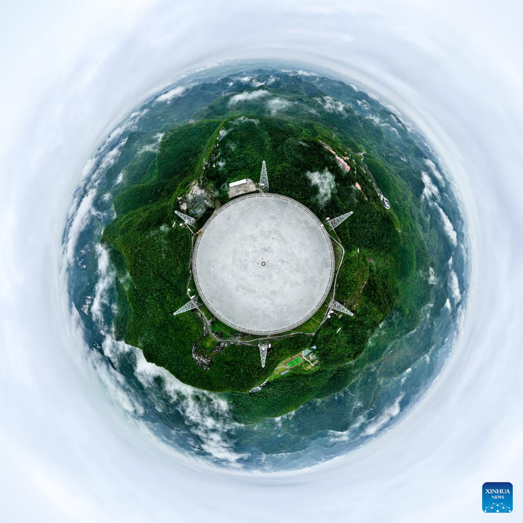 This aerial panoramic photo taken on June 22, 2023 shows China's Five-hundred-meter Aperture Spherical Radio Telescope (FAST) under maintenance in southwest China's Guizhou Province. China's FAST telescope identified a binary pulsar with an orbital period of 53.3 minutes, the shortest known period for a pulsar binary system.