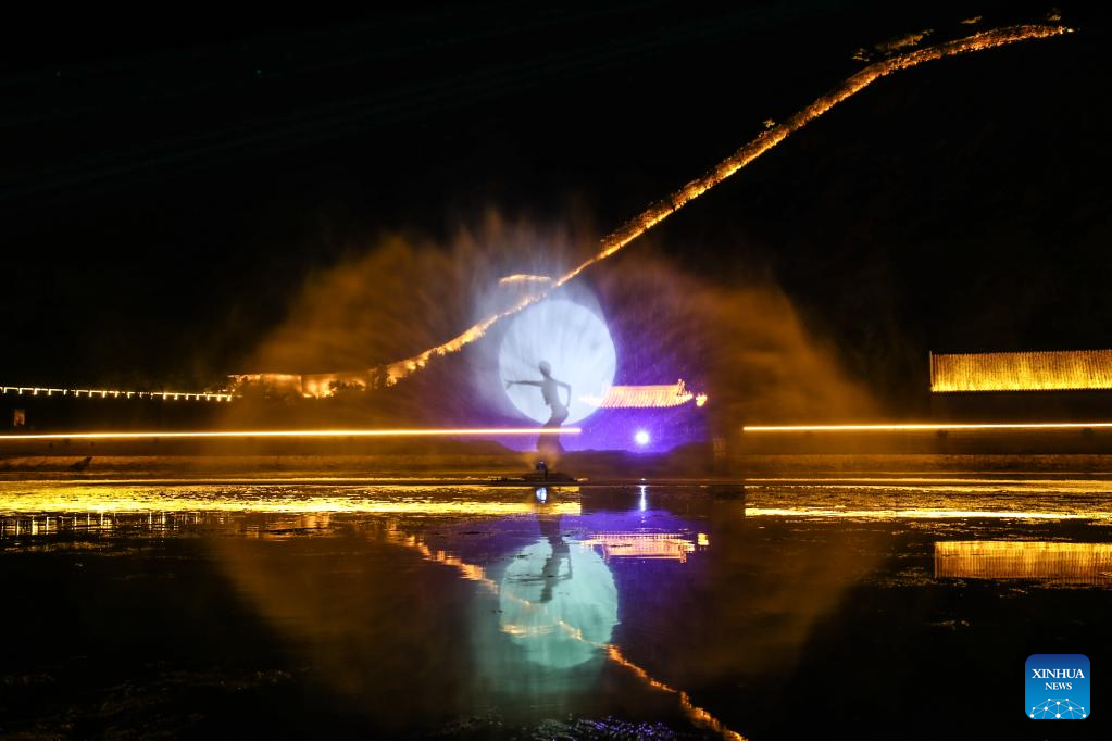 This photo taken on June 30, 2023 shows a water screen display at the Jiumenkou Great Wall scenic spot in Huludao, northeast China's Liaoning Province. In summer, Jiumenkou Great Wall is lit up as night falls. A series of activities in the scenic spot have attracted many tourists. (Xinhua/Pan Yulong)
