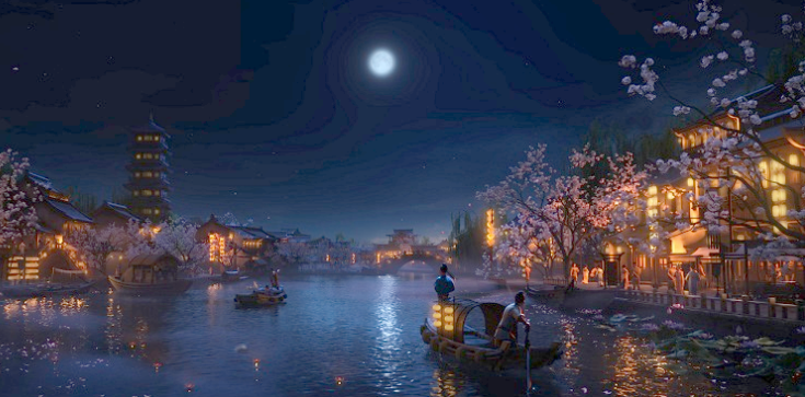 A still from the animated movie Chang’an featuring a poetic and picturesque night view in Yangzhou, a city along the Yangtze River.