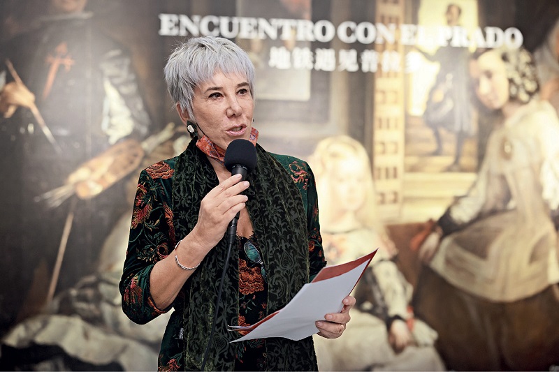Inma making an opening speech at the pop-up exhibition in Shanghai subway named Encounter the Prado on November 6, 2021.