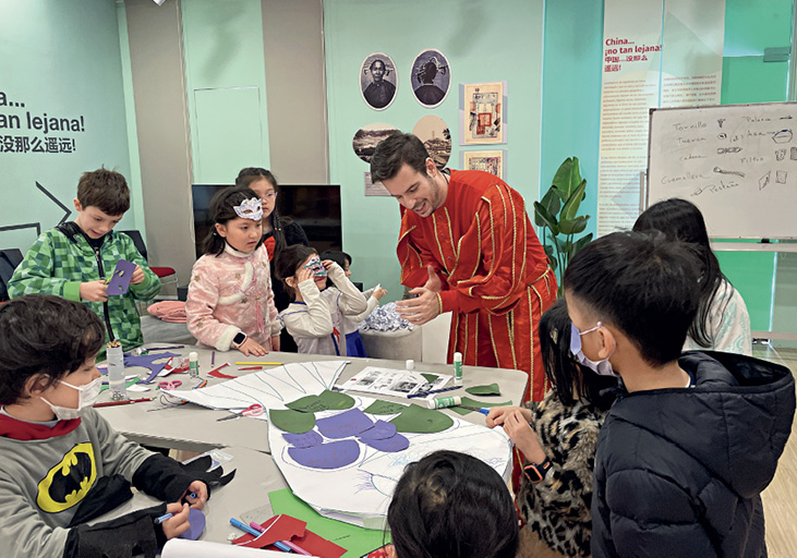 A group of children interacting with a Spanish teacher at a salon activity held in Miguel de Cervantes Library in Shanghai.
