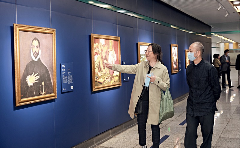Passengers in Shanghai’s Longhua Metro Station stopping to appreciate the exhibits of Encounter the Prado, featuring real-sized recreations of the Prado Museum’s most recognizable works.