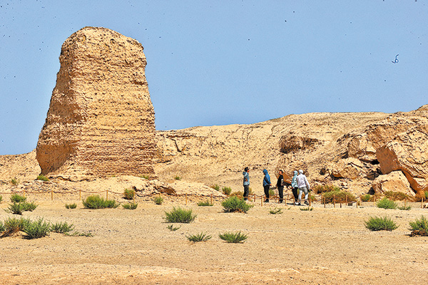 Visitors at the ruins of a beacon tower of the Han Dynasty (206 BC-AD 220) Great Wall in Dunhuang, Gansu province.[Photo by Jiang Dong/China Daily]