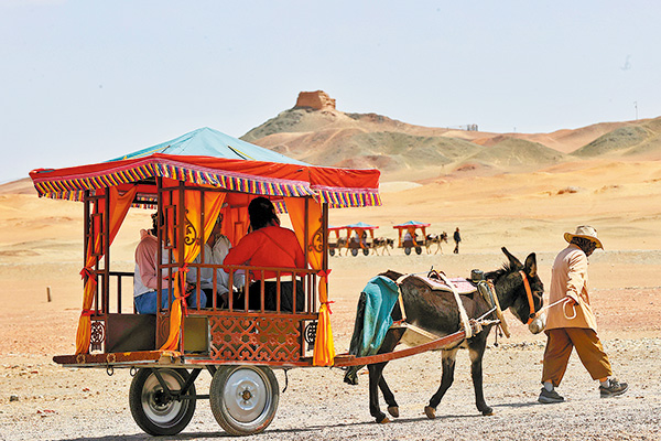 A donkey-driven carriage takes visitors to see the Yangguan Pass, Dunhuang, another important node at the west end of the Hexi Corridor.[Photo by Jiang Dong/China Daily]