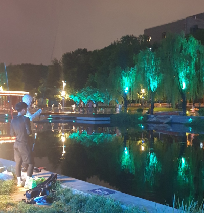 We find ourselves on the banks of the Liangma River in the popular Sanlitun commercial area of the capital's largest urban district, Chaoyang. Since summer 2022, the Liangma, winding its way through central Beijing, has become a hot spot for Beijingers to spend some off time. Both locals and expats flock here to squeeze a workout into their daily rush, to go night fishing, to hone their tai chi skills, to partake in a jam session, or to flaunt along the waterfront sights with lights switching from blue to green to purple to red casting a social media-friendly glow over the scenery.