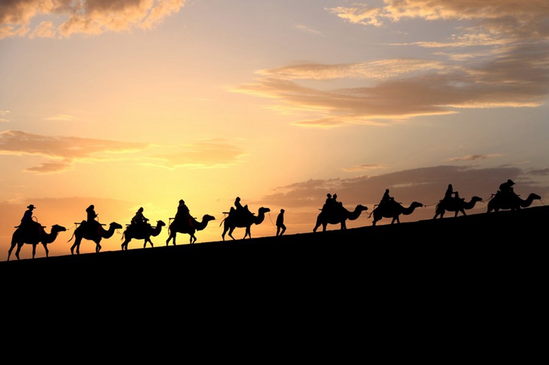 Tourists ride camels at the Mingsha Mountain and Crescent Spring scenic spot in Dunhuang, northwest China's Gansu Province, on July 15