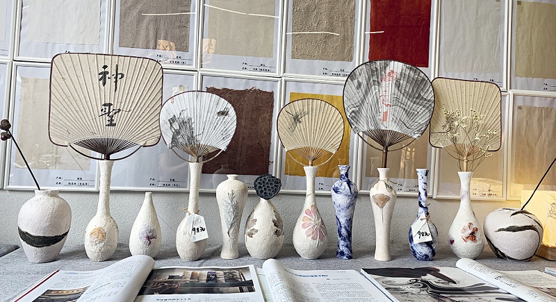 Fans and vases made from handmade paper are on display in the studio. Photos courtesy of Yang Bo The Creation of “I am Mr. Chu” On their journey, Cui and Yang discovered that due to the remote location of most paper workshops and traditional lifestyles of the paper-making craftsmen, their products are unable to directly reach the market. Therefore, Cui and Yang came up with the idea of establishing their own studio that could serve as a bridge to connect rural workshops with buyers and be a platform to promote traditional Chinese handmade paper. Chu is a kind of deciduous tree. Its bark is a common raw material that was used in papermaking in ancient times. Han Yu, a famous writer of prose during the Tang Dynasty (618-907) called paper Mr. Chu in his work Biography of Mao Ying. Since then, it has been used as a nickname for paper by Chinese literati. In 2019, Cui and Yang founded their own studio and named it “I am Mr. Chu.” In addition to selling handmade paper and related cultural products, Cui and Yang have also made a series of Chinese handmade paper samples. When they worked at the enterprise, Du Weisheng, an expert in the restoration of ancient books at the National Library of China, told them that, in the 1990s, a batch of Chinese paper relics collected in the British Museum needed to be repaired. The British team contacted China in search of the needed handmade paper. But the Chinese team could not find the related paper at that time. Eventually, Du used paper from Japan to repair them. They also learned that there was a complete paper tracing system in Japan, which allowed people to find information on various paper styles, techniques, and inheritors. However, there was no such system in China up to that point, so the expert could not find the needed paper in China. “This was shocking to us. Through our exploration, we realized that there was no lack of paper, but people did not know where to find it. We searched and discovered more and more types of paper through various channels,” said Cui. The two began to launch the series of handmade paper samples since 2021. Each volume consists of 30 types of handmade paper, each of which is sourced from its place of origin. At present, two volumes of the series have been produced, and they plan to produce 10 volumes. “We hope that this series can provide information for those who need handmade paper. Through this reading style design, we also expect that more people can learn about handmade paper in China,” said Cui. Besides, they also hold offline experience programs, lecture salons, and free classes at primary schools. In 2019 alone, they held 40 such events. Through making cultural and creative products of handmade paper, such as decorative lanterns, bookmarks, refrigerator decorations, and ink flow paper, they want more children and those who love traditional Chinese culture to be able to feel the charm of the ancient invention and the Chinese culture beyond that. “We bond with handmade paper not because we love paper, but because it has a tremendous charm that attracts us to dig deep to understand it. The more you explore it, the more you feel that there is so much wisdom contained in it that needs to be understood and passed on. There are also many stories connected with this traditional craft that always intrigue you,” Cui told China Today. |