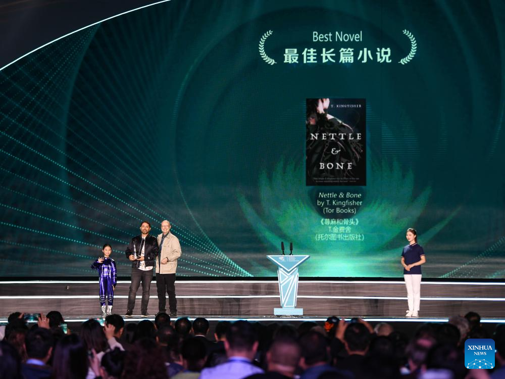 T. Kingfisher from the United States is awarded the Best Novel award for "Nettle & Bone" at the 2023 Hugo Awards during the 81st World Science Fiction Convention (WorldCon) in Chengdu, southwest China's Sichuan Province, Oct. 21, 2023. (Xinhua/Wang Xi)