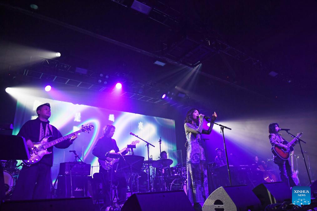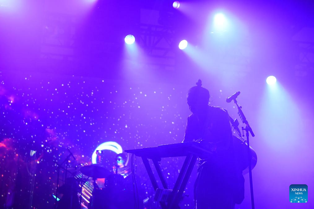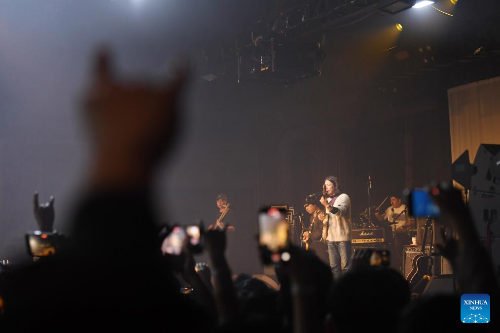 Members of Chinese band Omnipotent Youth Society perform during a Chinese music festival themed Friends From The East in New York, the United States, Nov. 26, 2023. Friends From The East continued the second leg on Sunday night in New York City, featuring Chinese bands The Landlord's Cats, Omnipotent Youth Society, and Miserable Faith. (Xinhua/Li Rui)