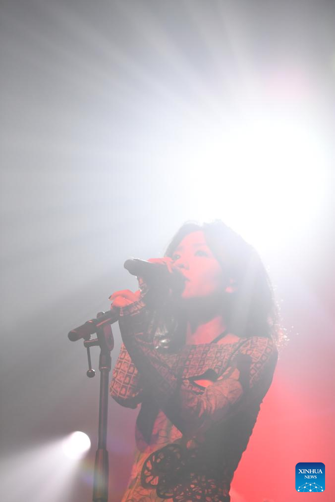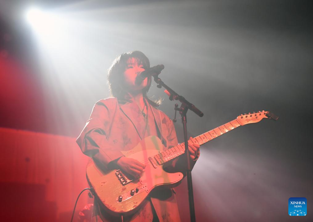 A member of Chinese band The Landlord's Cats performs during a Chinese music festival themed Friends From The East in New York, the United States, Nov. 26, 2023. Friends From The East continued the second leg on Sunday night in New York City, featuring Chinese bands The Landlord's Cats, Omnipotent Youth Society, and Miserable Faith. (Xinhua/Li Rui)