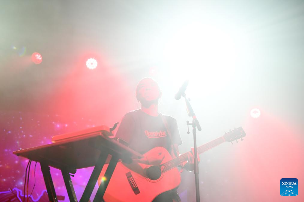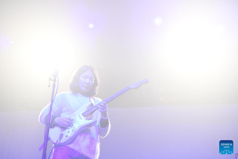 A member of Chinese band Omnipotent Youth Society performs during a Chinese music festival themed Friends From The East in New York, the United States, Nov. 26, 2023. Friends From The East continued the second leg on Sunday night in New York City, featuring Chinese bands The Landlord's Cats, Omnipotent Youth Society, and Miserable Faith. (Xinhua/Li Rui)