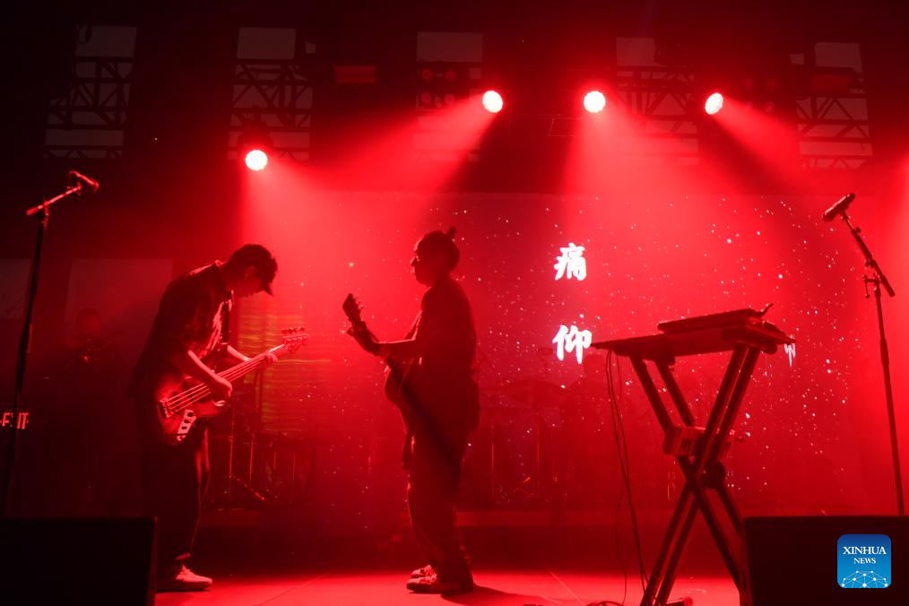 Members of Chinese band Miserable Faith perform during a Chinese music festival themed Friends From The East in New York, the United States, Nov. 26, 2023. Friends From The East continued the second leg on Sunday night in New York City, featuring Chinese bands The Landlord's Cats, Omnipotent Youth Society, and Miserable Faith. (Xinhua/Li Rui)