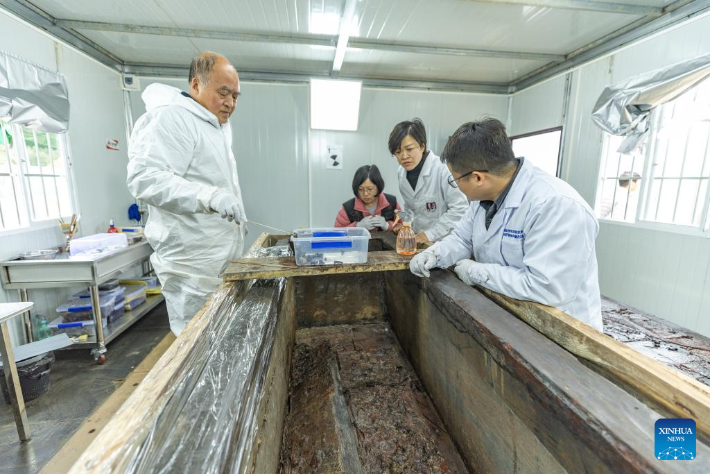 Archaeologists pack a wooden coffin unearthed from a tomb dating back to the Western Han Dynasty (202 BC-25 AD) in Wulong District of southwest China's Chongqing Municipality, Nov. 8, 2023. A well-preserved tomb, dating back to the Western Han Dynasty, with a clear recorded year has been discovered in Wulong District of Chongqing Municipality, the Chongqing Cultural Relics and Archaeology Research Institute said Tuesday.