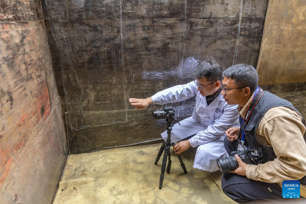Archaeologists make infrared photography of paintings at a tomb dating back to the Western Han Dynasty (202 BC-25 AD) in Wulong District of southwest China's Chongqing Municipality, Dec. 5, 2023. A well-preserved tomb, dating back to the Western Han Dynasty, with a clear recorded year has been discovered in Wulong District of Chongqing Municipality, the Chongqing Cultural Relics and Archaeology Research Institute said Tuesday.