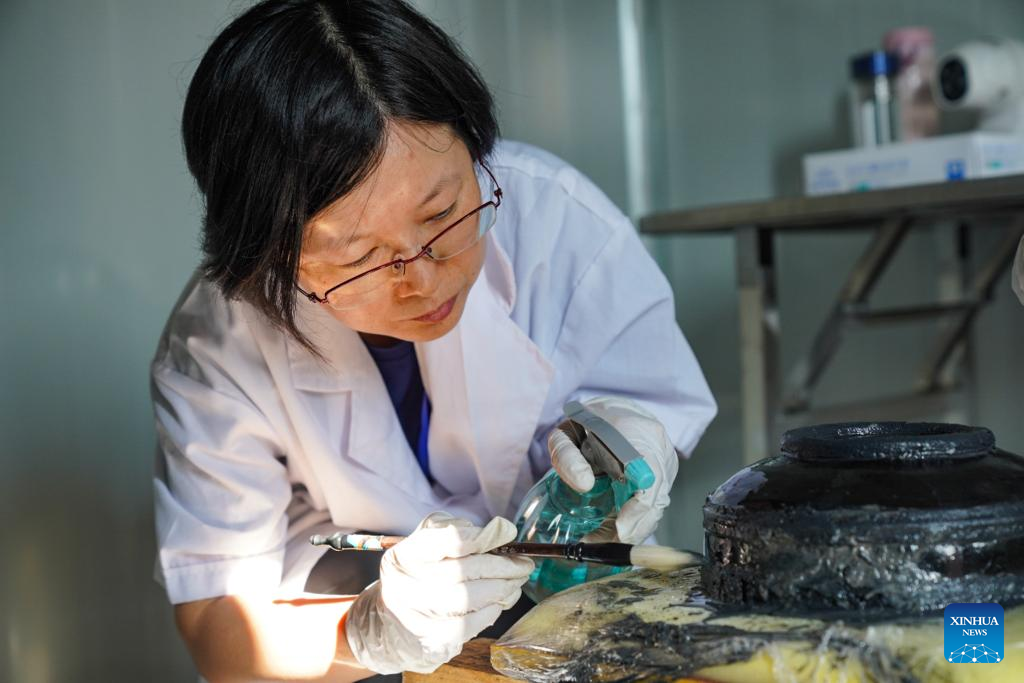 A staff member cleans a cultural relic unearthed from a tomb dating back to the Western Han Dynasty (202 BC-25 AD) in Wulong District of southwest China's Chongqing Municipality, Oct. 14, 2023. A well-preserved tomb, dating back to the Western Han Dynasty, with a clear recorded year has been discovered in Wulong District of Chongqing Municipality, the Chongqing Cultural Relics and Archaeology Research Institute said Tuesday.