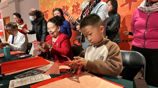 To celebrate the upcoming Year of the Dragon, a paper-cutting exhibition themed on China's dragon culture, showcasing exquisite works from 100 folk artists nationwide, kicked off at the Beijing Fengshang Art Museum on Monday.