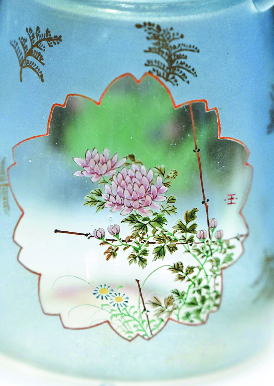 Objects show the varieties of color, shape and technique of glassmaking in China and Europe, as shown in floral details used for decoration. [Photo provided to China Daily]