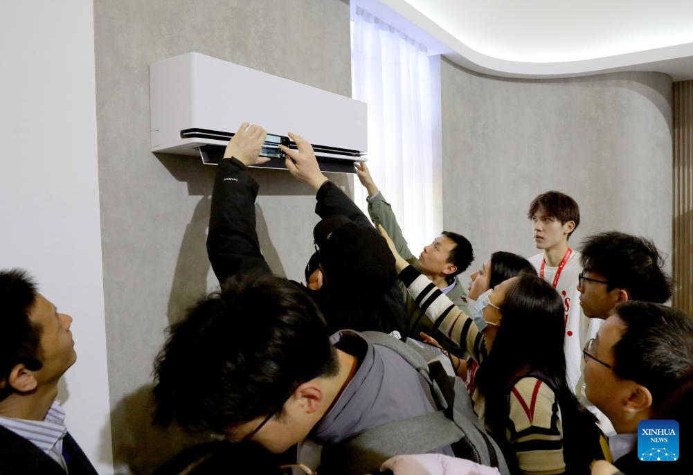 Visitors view an air conditioner at LG's booth during the 2024 Appliance & Electronics World Expo (AWE2024) in east China's Shanghai, March 14, 2024. With the theme of "Smartize the Future", the AWE2024 kicked off here on Thursday. The world's leading brands in the field of home appliances and consumer electronics gathered at the expo to showcase their latest innovations. (Xinhua/Fang Zhe)