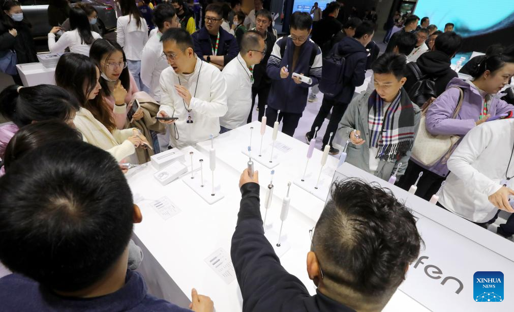 Visitors discuss about Laifen's electric toothbrushes during the 2024 Appliance & Electronics World Expo (AWE2024) in east China's Shanghai, March 14, 2024. With the theme of "Smartize the Future", the AWE2024 kicked off here on Thursday. The world's leading brands in the field of home appliances and consumer electronics gathered at the expo to showcase their latest innovations. (Xinhua/Fang Zhe)