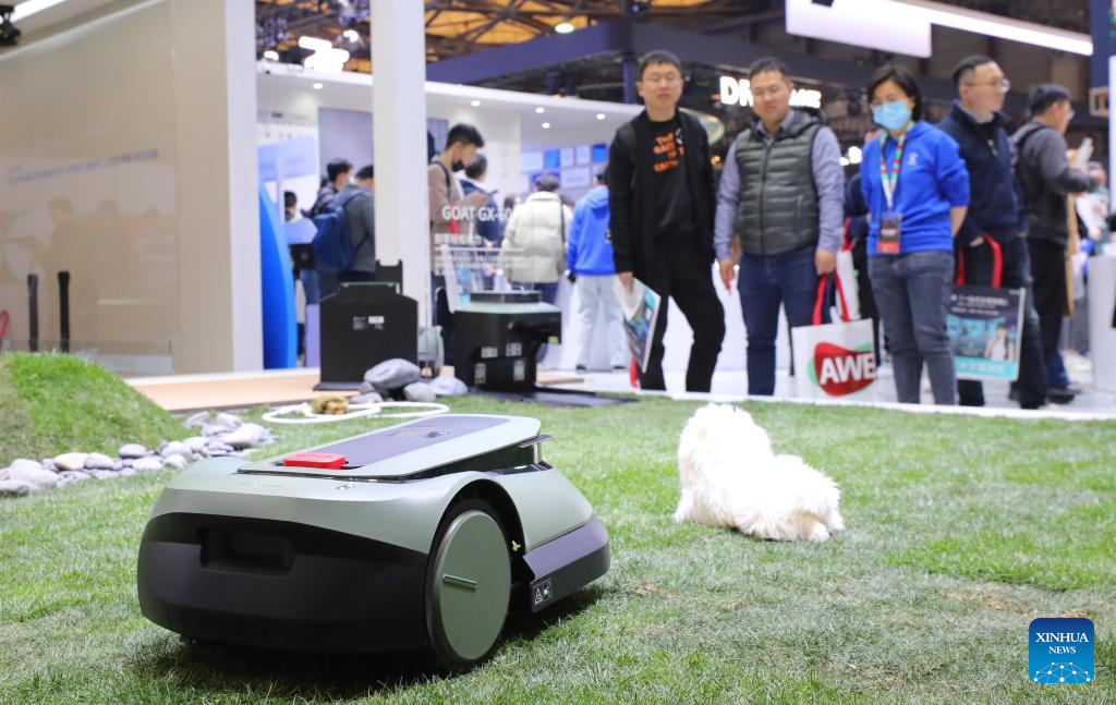 A lawn mowing robot from Ecovacs demonstrates during the 2024 Appliance & Electronics World Expo (AWE2024) in east China's Shanghai, March 14, 2024. With the theme of "Smartize the Future", the AWE2024 kicked off here on Thursday. The world's leading brands in the field of home appliances and consumer electronics gathered at the expo to showcase their latest innovations. (Xinhua/Fang Zhe)