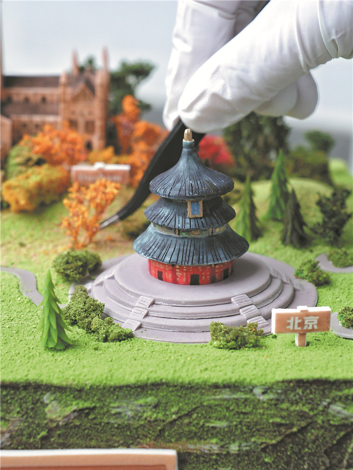 Baker Wang Fang has made cakes depicting 1,800 destinations, including the Temple of Heaven in Beijing. [Photo provided to China Daily]