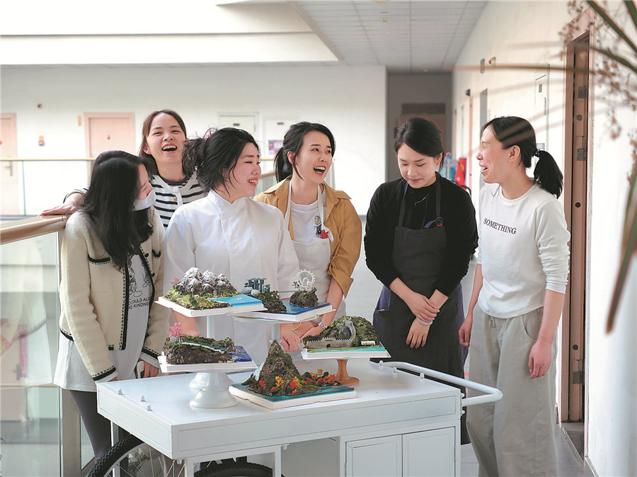 Wang (third from left) explains the techniques involved in elaborate cake making to her students. [Photo provided to China Daily]