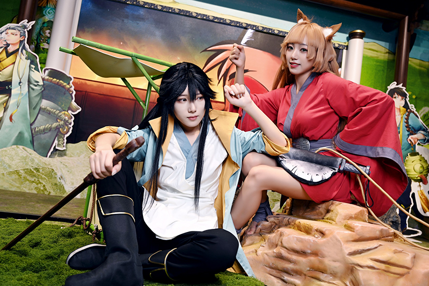 Two attendees in costume pose at the booth of a Chinese roleplaying game on Tuesday. Photo: IC Photo