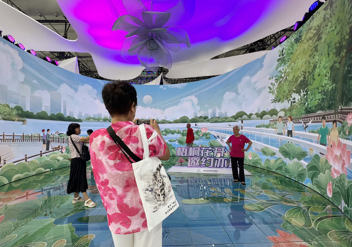 Visitors take photos in front of a panoramic animation scene at the 2023 China International Fair for Trade in Services on Sept 5, 2023. [Photo/Xinhua]