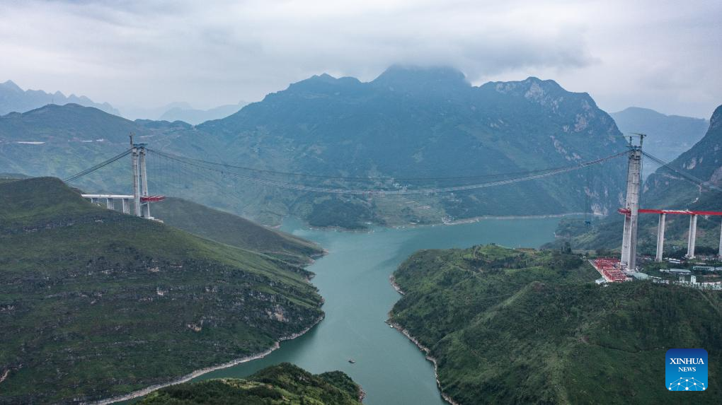 This aerial photo taken on Oct. 11, 2023 shows the construction site of Zangke River bridge on Nayong-Qinglong Expressway in southwest China's Guizhou Province.