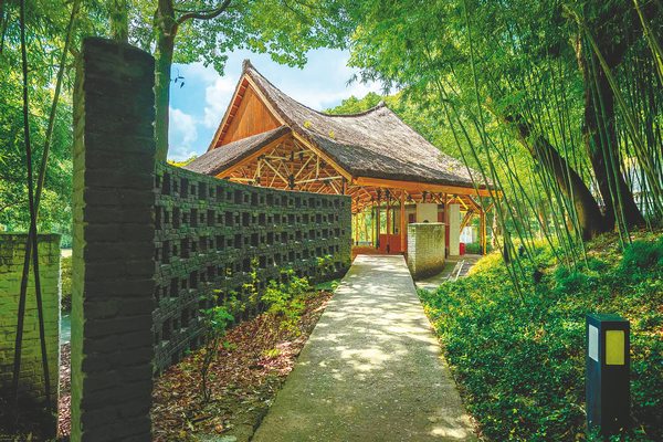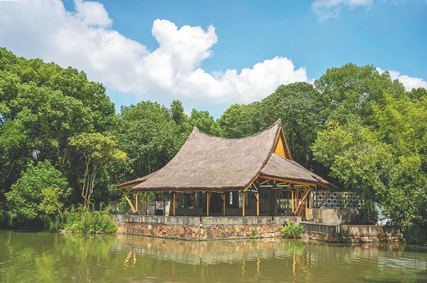 The thatch-roofed pavilion supported on bamboo pillars was built in 1986.The 510-square-meter structure is 7 meters high, 16.8 meters long and 14.5 meters wide, and its high arched roof was inspired by traditional rural residences in the Yangtze River Delta.
