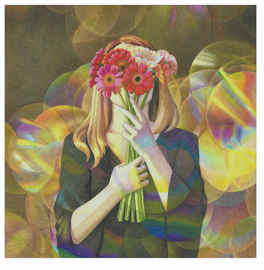 The sense of power subtly emanating from Qiu Dandan's paintings stems from the artist's solitary moments. In the painting, a female figure stands in bubblelike halos of light, with her face concealed by a bouquet of flowers.