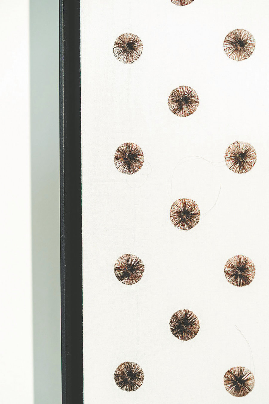 In Polka Dot-white, she sewed strands of her mother's hair onto a black cloth in the form of polka dots. Conversely, her mother, using Cai's naturally shed black hair, created another artwork in a slightly folkloric style. Although both artworks adopt the polka dot form, they evoke entirely different feelings when presented.