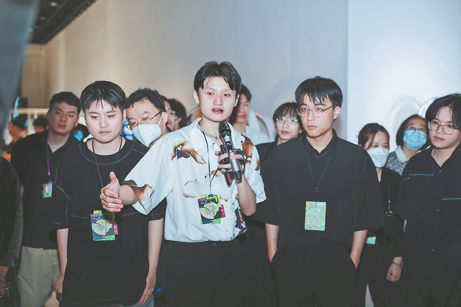 He Chenghao (center), a graduate, introduces his artwork to visitors. CHINA DAILY
