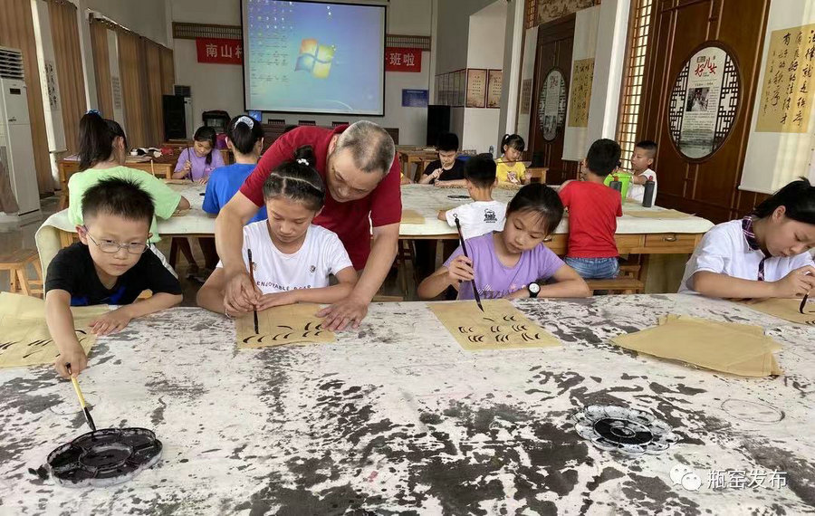 Students practice calligraphy in Nanshan village, Yuhang district. [Photo provided to China Daily]