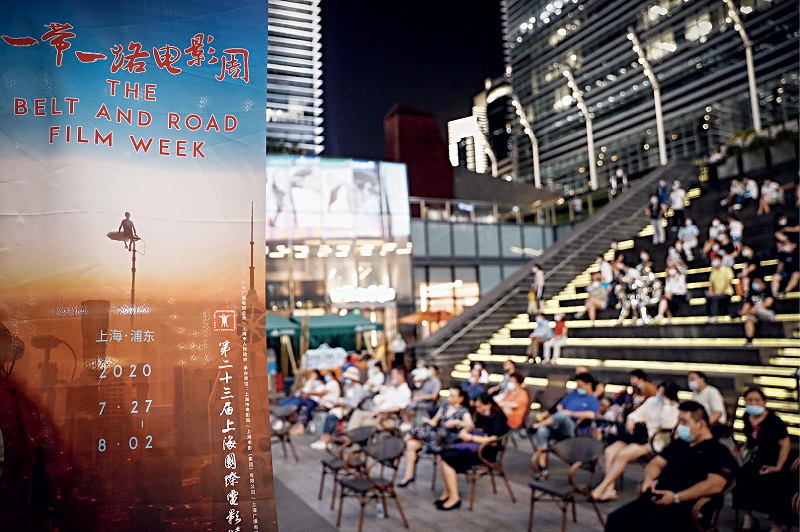 People enjoy an outdoor movie screening at the Belt and Road Film Week in Shanghai on July 27, 2020.