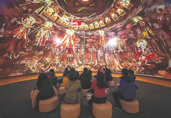 An audience watches a movie based on the murals of Fahai Temple in a 3D cinema in the art center in May 2023. [Photo provided to China Daily]