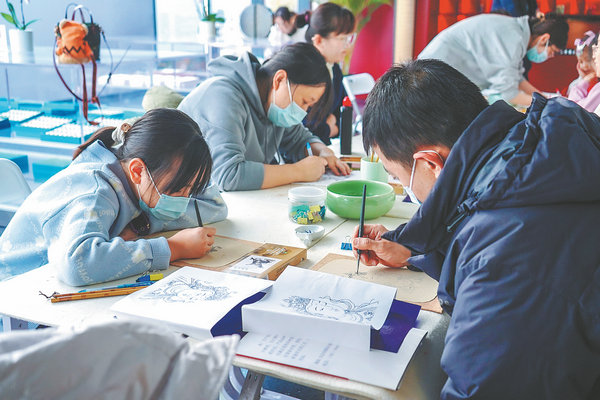 Visitors turn their hands to making murals with traditional methods at the Fahai Temple Mural Art Center in December 2023. [Photo provided to China Daily]