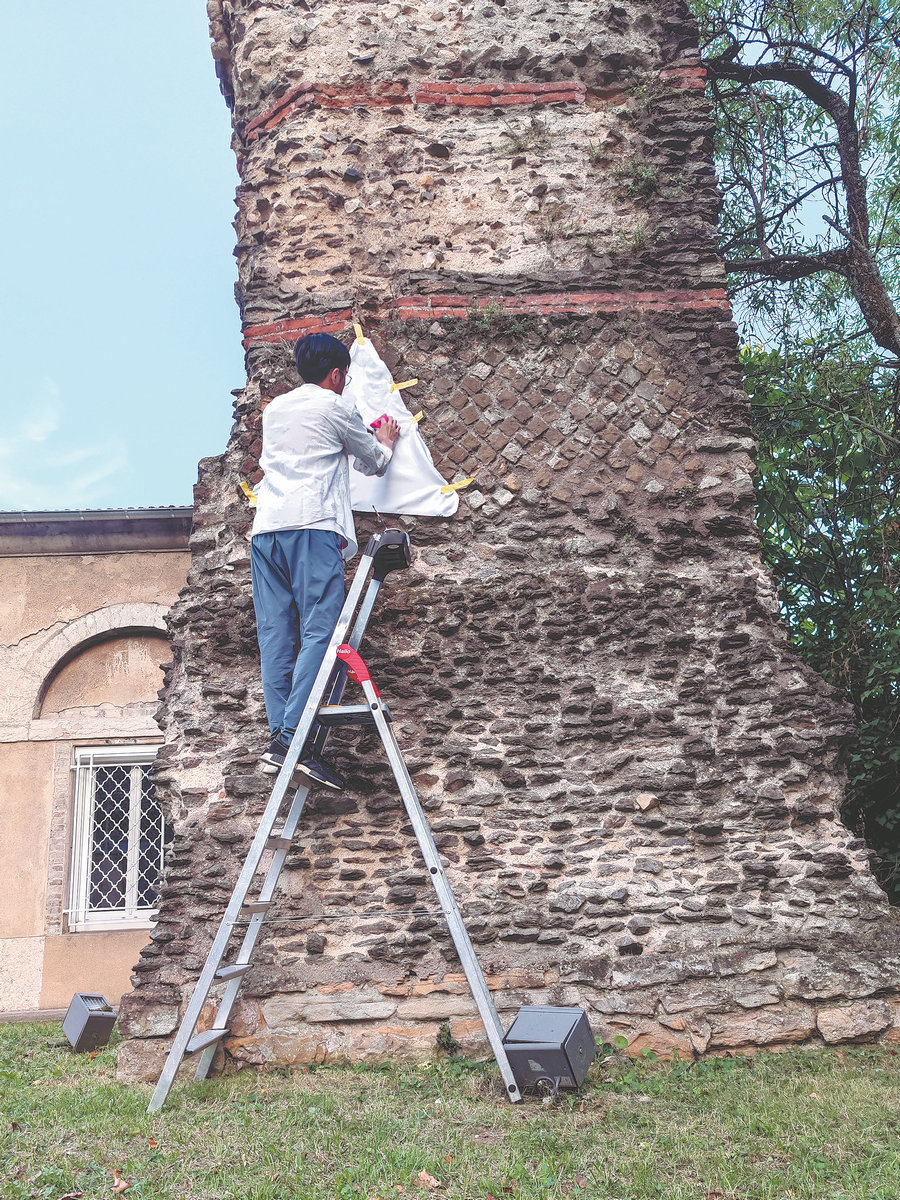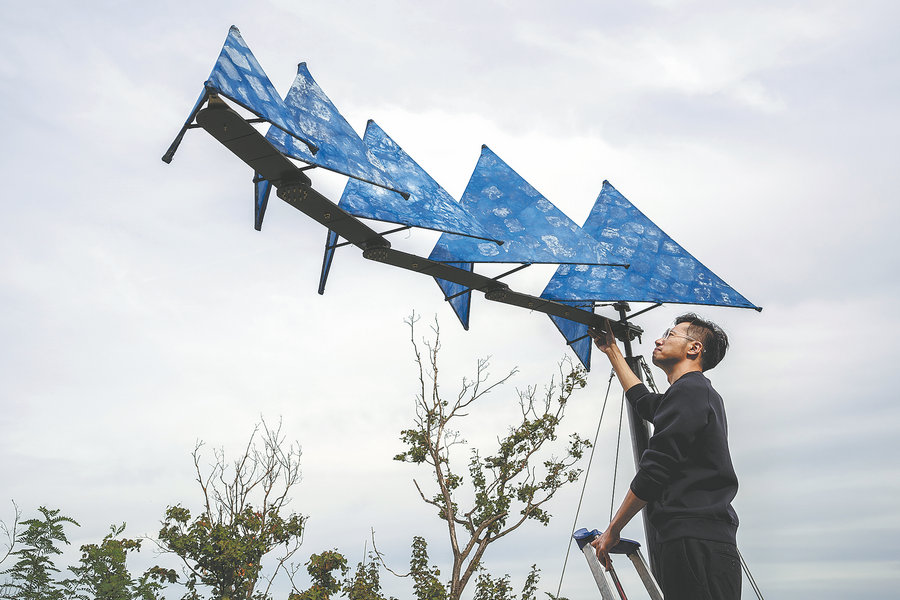 Yishu 8's China Prize laureate Wang Enlai positions his artwork during residency in France. [Photo provided to China Daily]