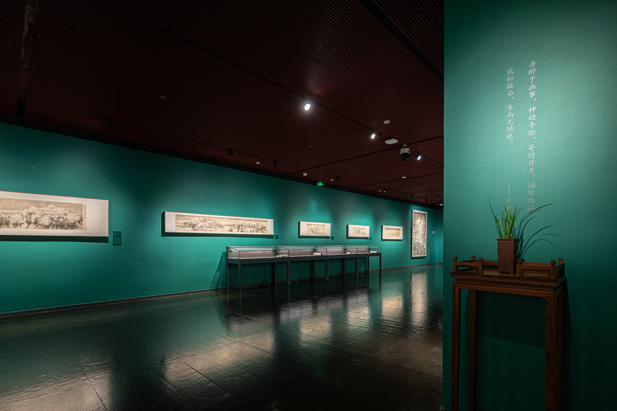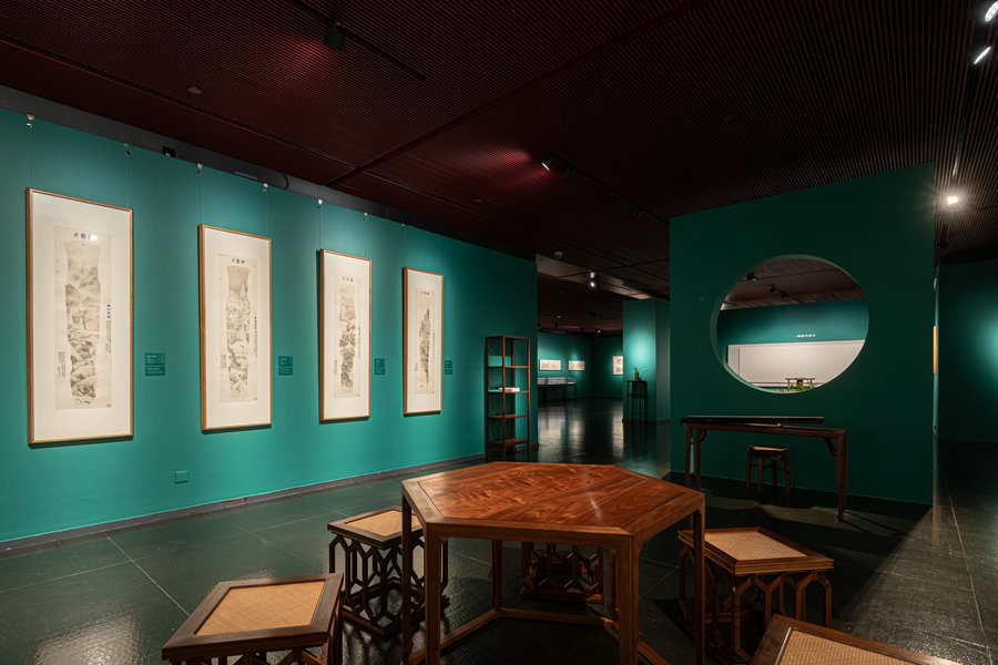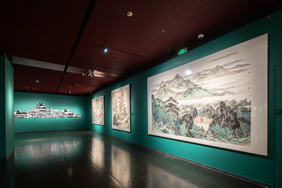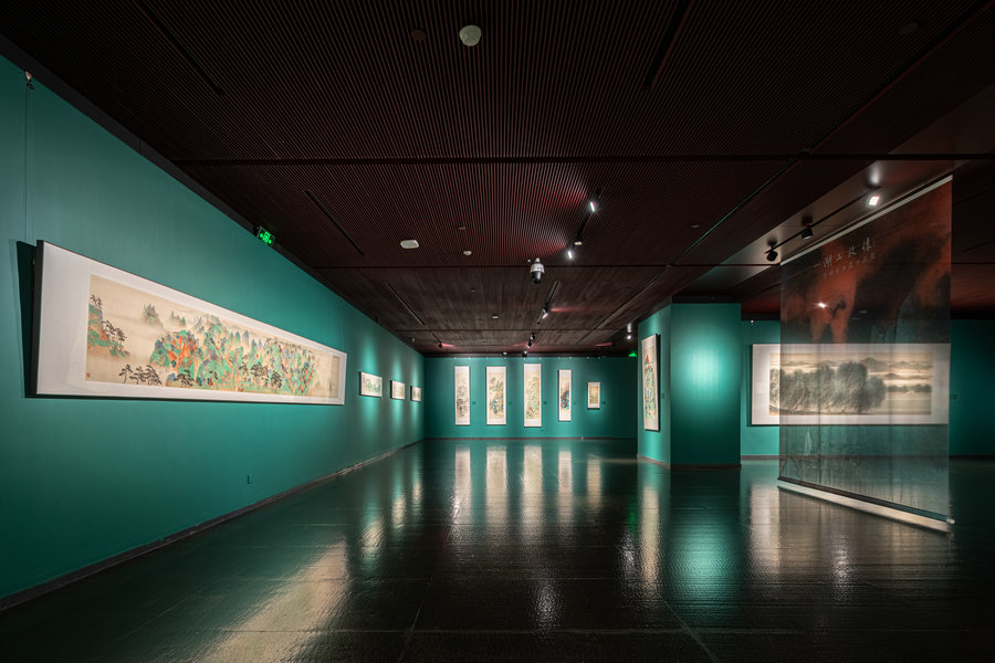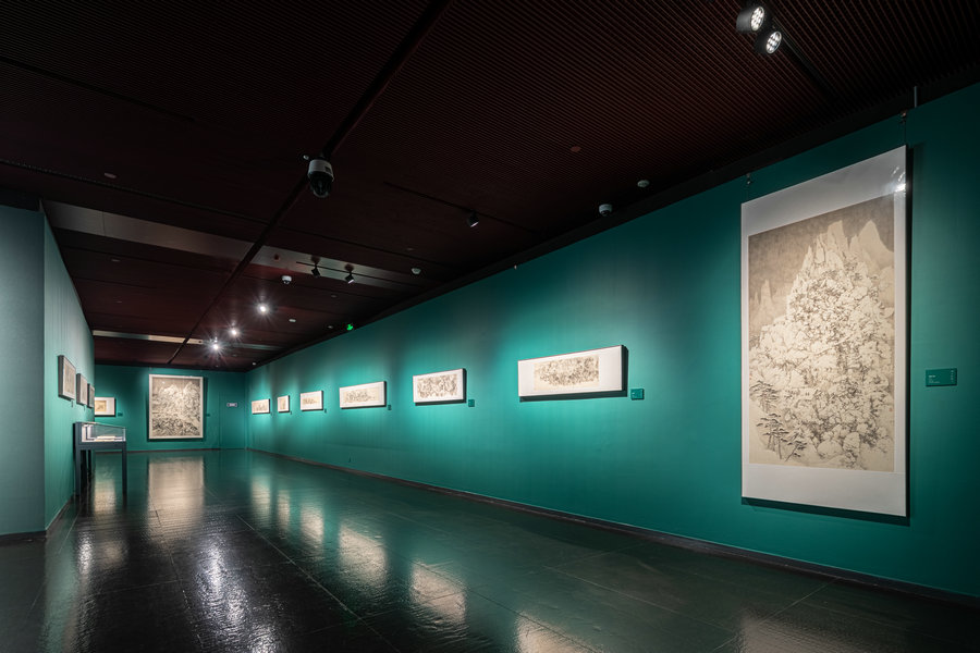 The landscape paintings on show include both colored and monochromatic. The colored works show his experiment of the qinglyu (blue-and-green), a unique genre of classical Chinese paintings of which a lot of blue and green are applied to create a majestic atmosphere.