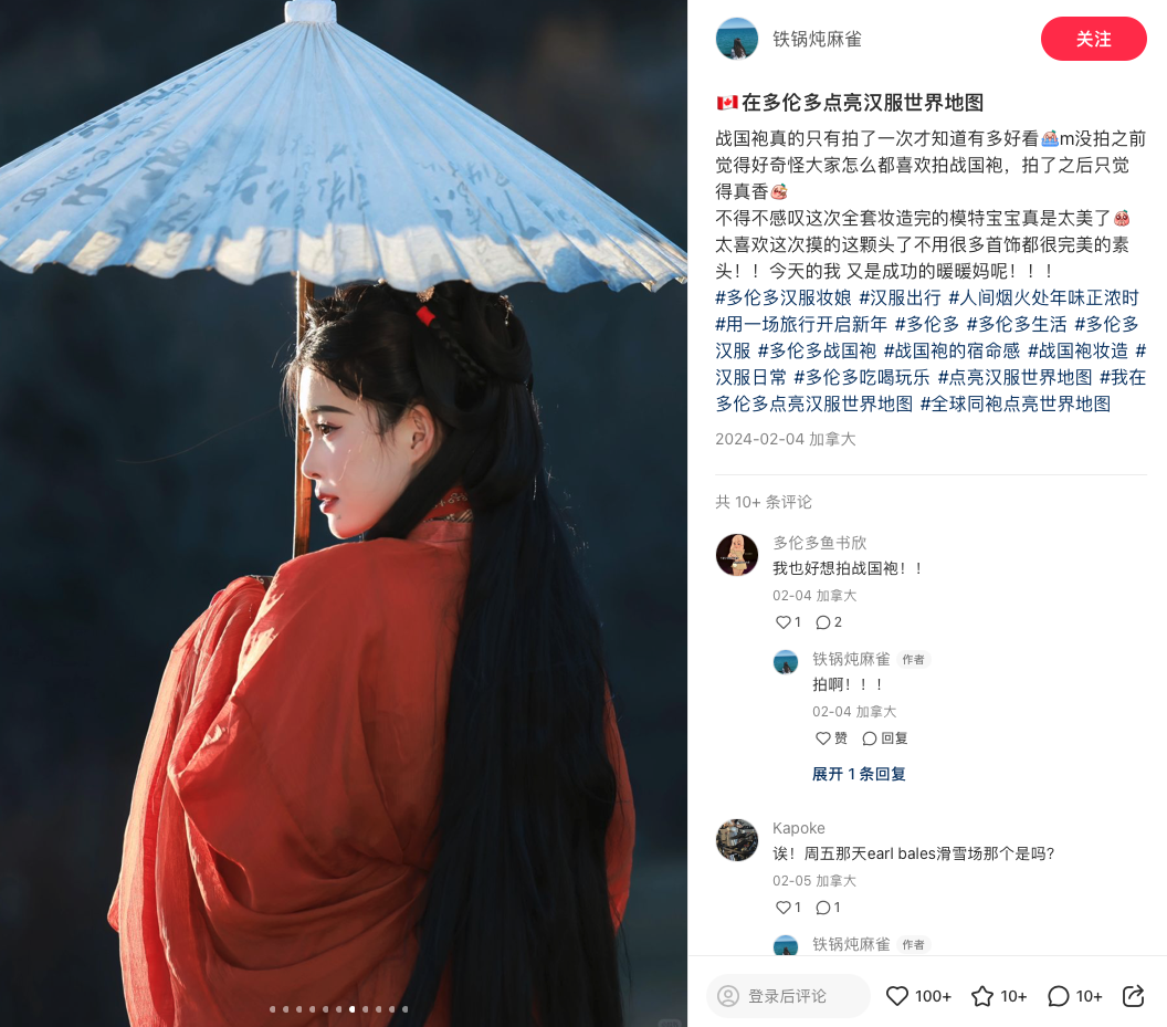 A screenshot from Xiaohongshu shows a photo of a Chinese woman dressed in traditional Chinese costume in Toronto, Canada.[Photo/CGTN]