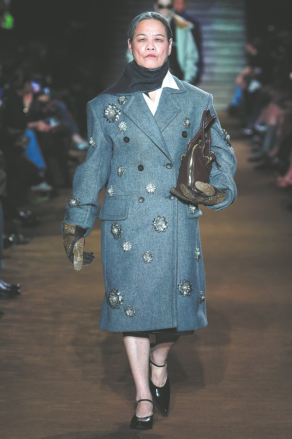 Qin Huilan, 71, a retired physician, takes to the runway at Paris Fashion Week for Italian brand Miu Miu's Fall and Winter 2024 collection show. [Photo provided to China Daily]