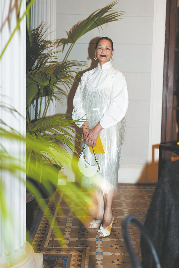Qin shows an elegant white dress and bag. [Photo/Courtesy of Walking Town]