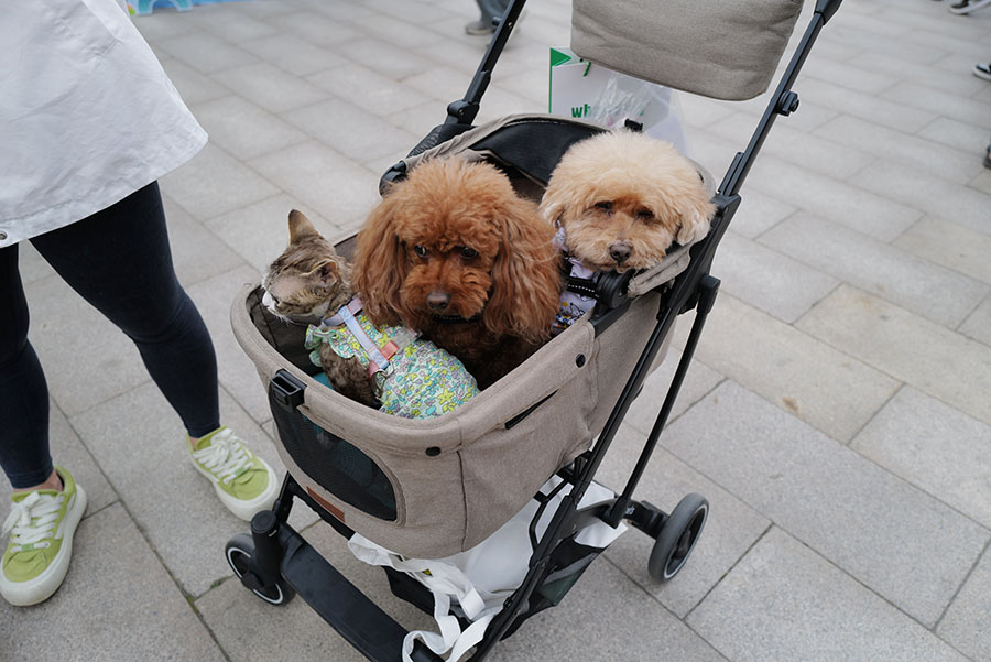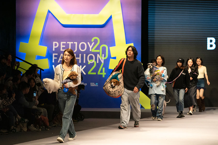 Groups of adorable pet cats and dogs dressed in gorgeous clothes walked along with their owners on the runway of a three-day pet fashion show that kicked off on Saturday at the Shanghai Fashion Center.