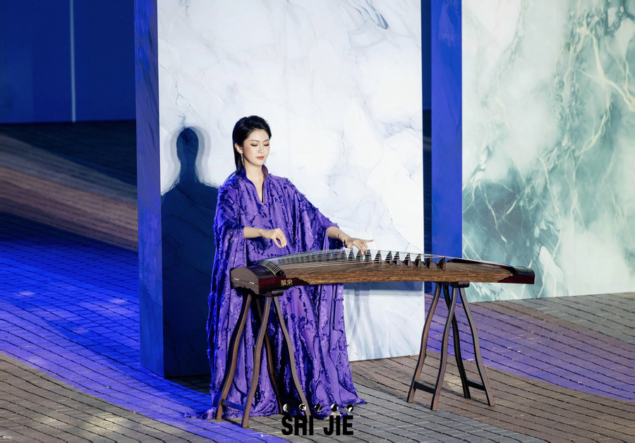 An artist performs guzheng(a Chinese plucked string instrument) for the launch of SHI JIE 2024 A/W collection “The Child of Nature—Rough Jade” in Hangzhou, East China’s Zhejiang province on March 30, 2024. [Photo provided to chinadaily.com.cn]