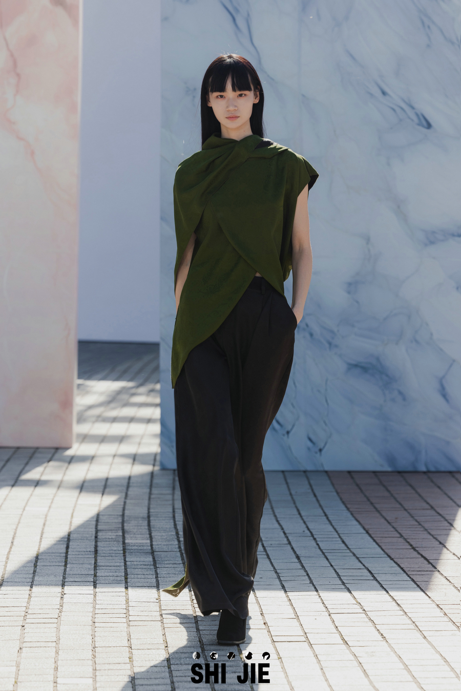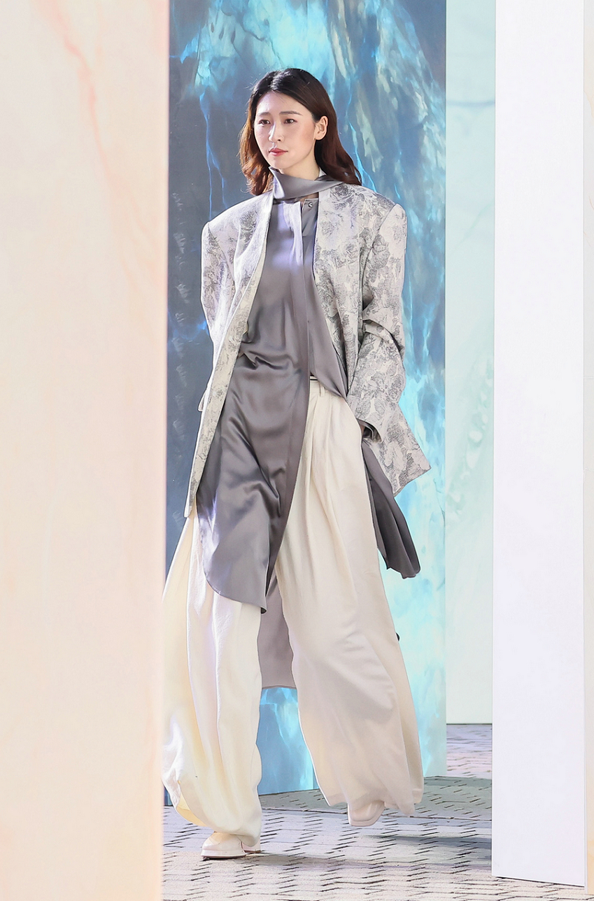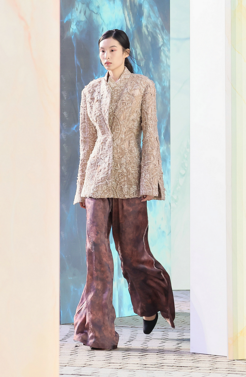 A model presents garments from SHI JIE 2024 A/W collection “The Child of Nature—Rough Jade” in Hangzhou, East China’s Zhejiang province on March 30, 2024. [Photo provided to chinadaily.com.cn] [Photo provided to chinadaily.com.cn]