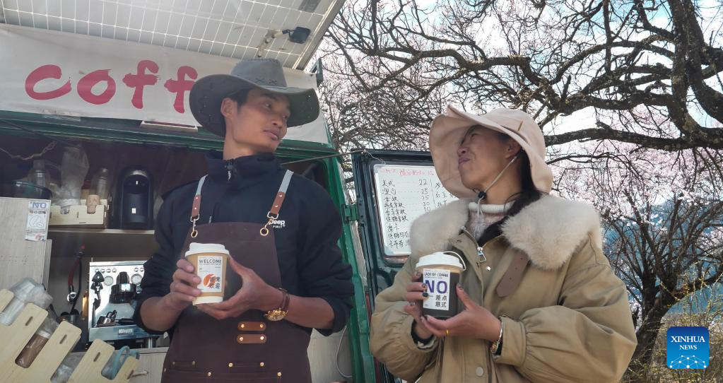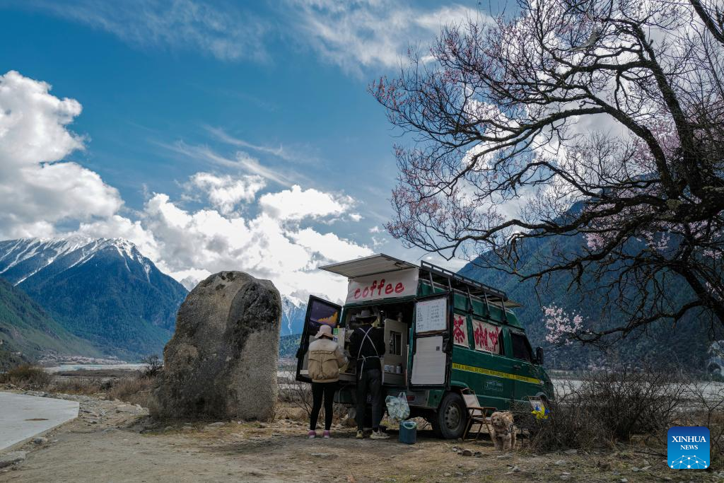 While many people might search online for answers to questions like whether new energy vehicles are suitable for plateau regions when preparing for a road trip to southwest China's Xizang Autonomous Region, Mu Yiping and his wife Tan Yan had a different focus. They were preoccupied with finding out where to buy coffee beans. The pink spring treat of peach blossoms in Xizang in late March is a sight to behold, attracting crowds of tourists. This young couple from southwest China's Chongqing Municipality had also traveled to the region to relish this enchanting beauty. However, what sets their trip apart is the addition of a green coffee van. "I have long been looking forward to visiting Xizang," said Mu, 32. "And then I had this idea of running a mobile coffee van business that allowed me to fund my travels while enjoying the trip." It took the couple around six months to modify the van. To ensure they reach Nyingchi City before the peach blossom season, the two embarked on their journey from Chongqing in late February. But the journey to the plateau was no easy task. While driving through one of the mountain passes at about 4,400 meters above sea level, they were stranded for two days due to the heavy snow and could only eat and sleep in the coffee van. "After hitting the road, we found that the trip might not be as wonderful as we had imagined. We often encountered unexpected problems with water and power supply and it was also difficult to replenish the ingredients on the road," Tan said. The couple continued to make progress with their coffee business as they continued with their mountain adventure, setting up stalls on the roadside during traffic jams. They also began to serve new beverages infused with Tibetan characteristics. In mid-March, while the peach trees were still in the bud-burst stage, the couple arrived in Bome County in Nyingchi and decided to stay for a while. Despite the tiring drive, the stunning views made it all worthwhile. They spent nearly 20 days in Bome, eagerly waiting for the peach blossoms to bloom into beautiful pink flowers that covered the mountainside. "The scenes are fantastic and made our day," Mu said, adding that what impressed them is not only the scenic beauty but also the incredible changes Xizang has undergone over the past few years. "Compared to my last visit to Xizang, I have noticed significant improvements in the quality of public facilities such as roads and scenic spots, which now boast better quality services," Mu explained. In recent years, Xizang's focus on infrastructure development and efforts to promote its tourism industry has made it an increasingly popular holiday destination for travelers. Data revealed that from January to February, Nyingchi received over one million tourists from home and abroad, generating tourism revenue of 906 million yuan (about 131.7 million U.S. dollars). "Whether it's camping or self-driving tours, everything is so convenient in Xizang," Mu said. ■