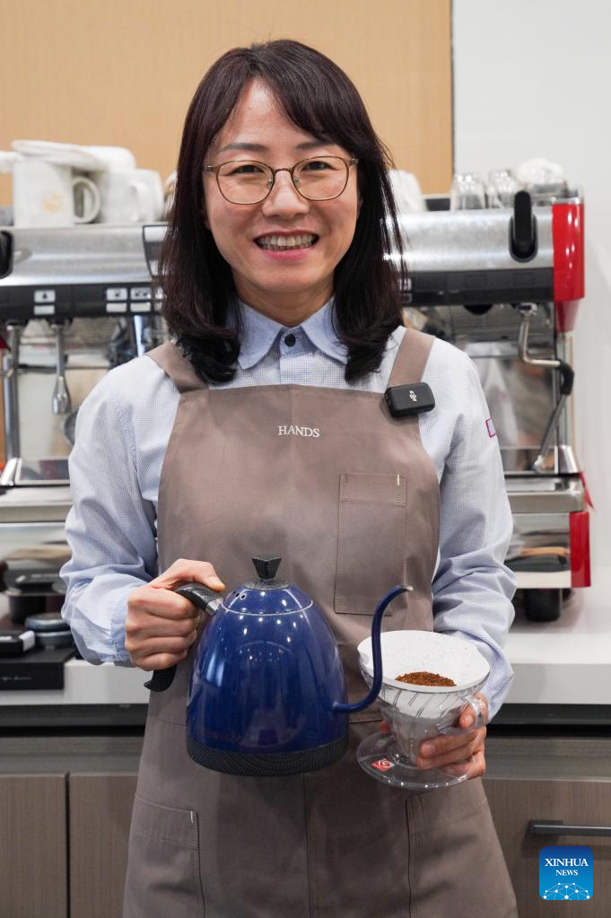 Li Xiangying poses for a photo in Yanji, Yanbian Korean Autonomous Prefecture, northeast China's Jilin Province. In 2022, Li Xiangying and her husband opened a cafe with characteristics of the Korean ethnic group in her hometown Yanji. Combining local specialty apple pears and folk customs of the Korean ethnic group with coffee, they promote native folk culture to tourists through coffee while enriching the coffee culture in Yanji. The northeastern border city of Yanji in Yanbian Korean Autonomous Prefecture has witnessed a spark of coffee trend as over 540 coffee shops are registered in the 680,000 dwellers city in recent years. According to the data from Meituan Waimai, a major food delivery platform in China, Yanji ranked first in coffee consumption among counties (including county-level cities) in China from January to February this year. (Xinhua/Yan Linyun)